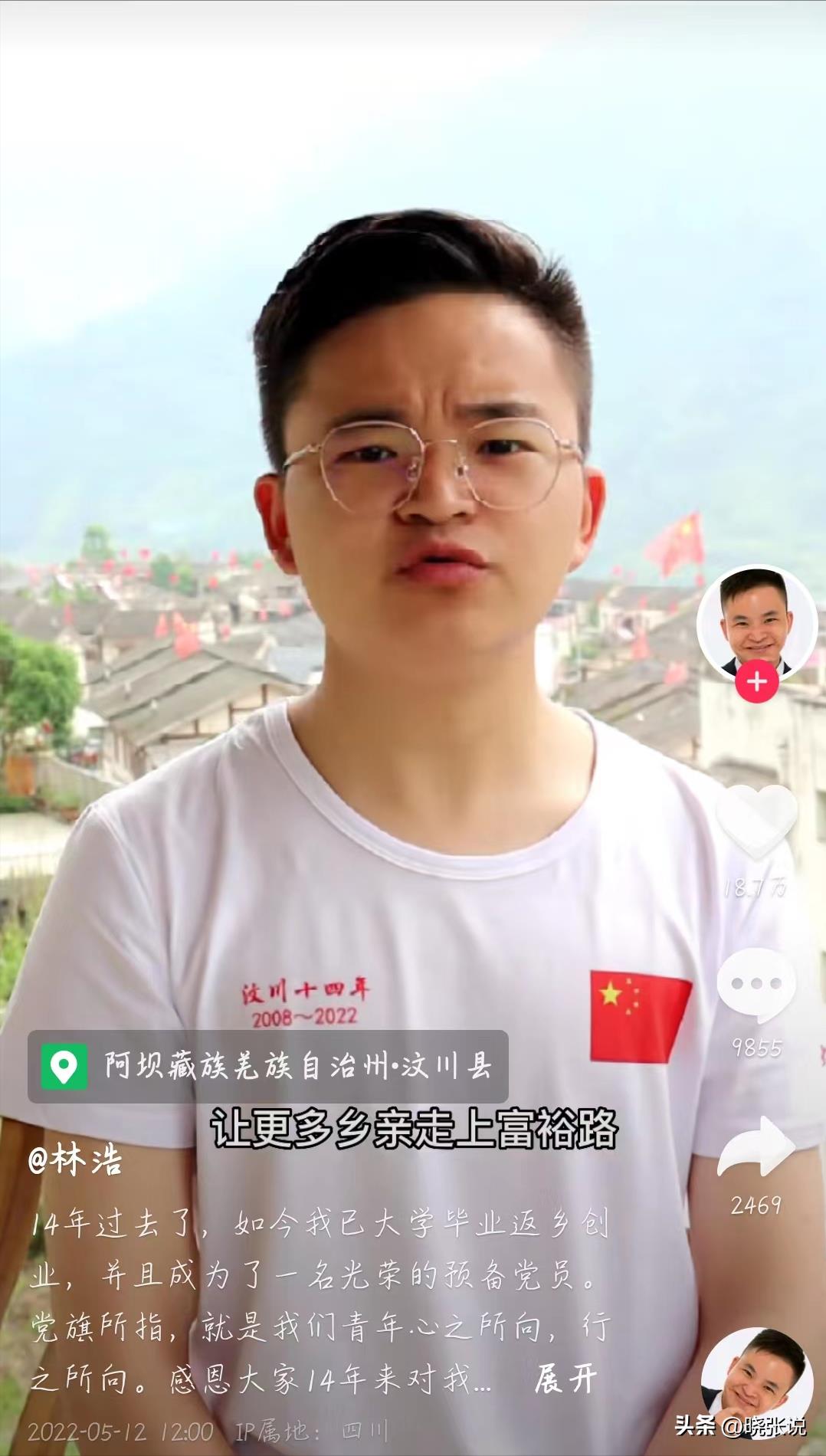 2023年5月12日,林浩在抖音发布视频。他身穿汶川无忧志愿者的红马甲,胸前佩戴着党徽,向大家分享自己返乡创业的快乐,他表示作为乡村守护人,会长期扎根在映秀,一定要将助农和文旅事业搞起来!