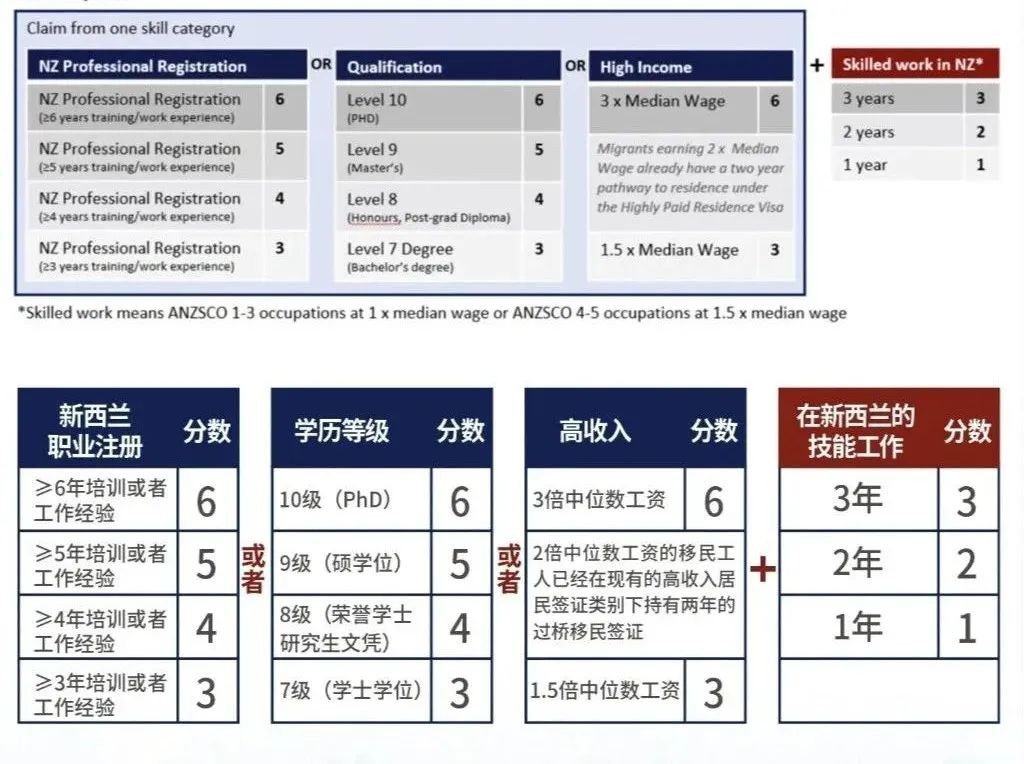 6分制技术移民的主要评分根据工作经验、学历、收入(三选一)加上新西兰的工作年限。具体请看下图。
