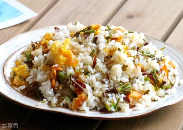 第四步,接着加上米饭开始翻炒,翻炒后加上香椿芽,再加盐后即可。