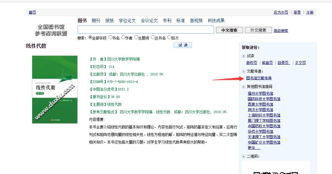 全国图书馆参考咨询联盟拥有广阔的资源,在搜索栏输入想要的教材名称后,点击搜索,同样会出现大量书籍,选择自己想要的内容,然后在跳转后的界面点击文献传递,填上自己的邮箱后,就可以等着发送过来.。
