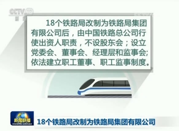 央视网消息(新闻联播):中国铁路总公司今天(19日)发布消息,其所属全国18个铁路局都已经完成了公司制改革工商变更登记,今天正式挂牌运营。这标志着中国铁路从传统生产型企业向现代经营型企业转型迈出了重要一步。