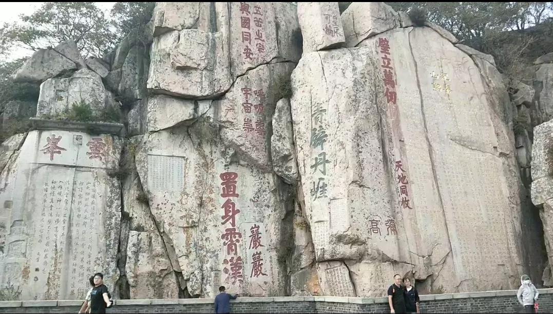 这个就是最精彩的大观峰摩崖石刻,整片崖壁上可辨认的题刻有七十多处,可谓洋洋洒洒非常壮观,所以得名大观峰。其中唐摩崖是大观峰的经典之笔,贴金之作,唐玄宗皇帝御笔亲书,开元14年,即公元726年9月,唐玄宗皇帝亲笔书写了《纪泰山铭》,以昭告天下自己封禅泰山是为百姓祈福。
