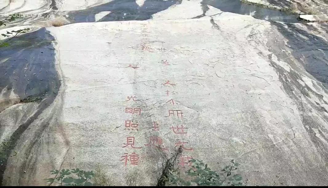 这是经石峪的《金刚般若波罗蜜经》一部分,整个经文在两千多平方米的缓坡石坪上,自东向西刻着。现仅存经文41行1069个字,原先据说2799个字,每个字的字径是50cm。