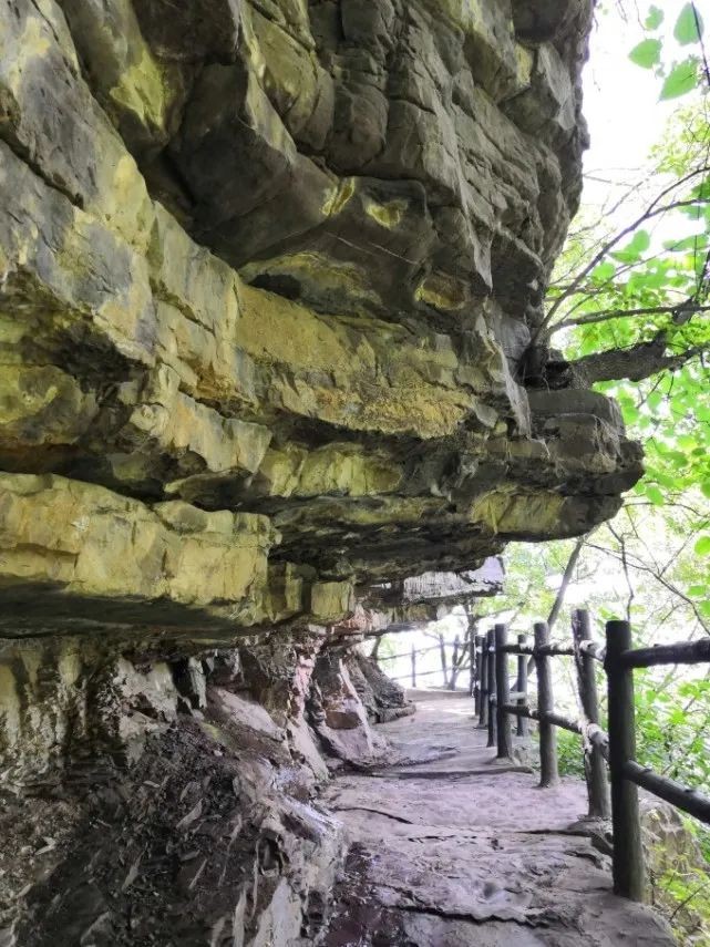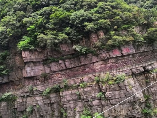 看侧面那段栈道崖壁上写看揽胜,绝壁栈道随着岩体明显倾斜,断层痕迹几乎平行。距今17亿年的时候, 舞钢 灯台架的地质环境受地壳运动的强烈变化,地下的岩石与地层受到高温压变的影响,海地提升为陆地,进入长期受剥蚀状态。