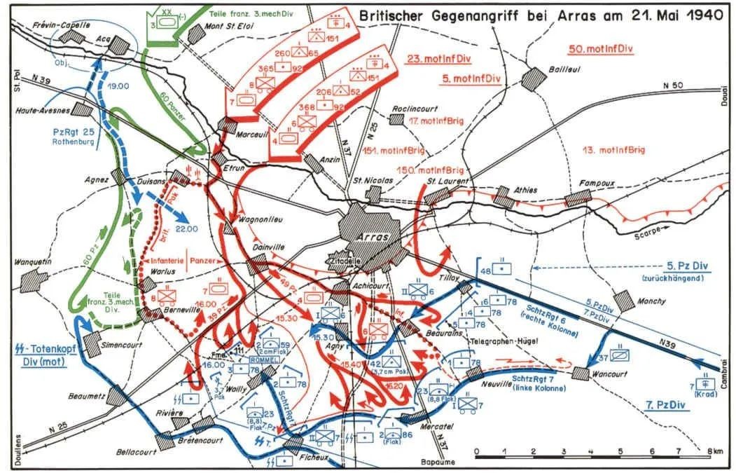 龙德施泰德是老资历的高级军官了,为什么如此阻挠近在眼前的战果?事情就坏在他的身经百战上:他仍然还记得一战中法国陆军的强大,在法国战役开始后,他就一直警惕着法国人可能会集结起强大的预备队兵力进行反冲击。曼施坦因计划确实非常成功,不仅打瘫了远征军,也打懵了龙德施泰德等一票高级军官,他们无论如何不愿意相信法军如此不堪一击,他们更愿意想象法国人在准备一支强大的力量准备在德国人的腰腹上来一记重拳。而5月21日远征军为了突围发起的阿拉斯反击成为了压垮龙德施泰德神经的最后一根稻草——英军50师151旅和英军第1装甲旅连同法军第3轻机械化师和第13坦克营由北向南突围。德军完全没有做好准备,被英军深入纵深16公里,前来堵口子的德军第7装甲师一头撞进法国人的伏击圈,损失20多辆坦克。隆美尔使尽浑身解数才在日落时分将英国人赶回去,包括著名的“88炮打坦克”事件。当龙德施泰德问责的时候,隆美尔声称“遭到5个师几百辆坦克的进攻”!这些突然的反击和指挥官的瞒报耗尽了龙德施泰德的判断力,他现在很相信,远征军手里还捏着许多实力强劲的有生力量准备在德军冒进的时候打一个漂亮的伏击战(实际上远征军的预备队在5月16日就耗光了)。所以在24日和希特勒的会议上,他多次强调德军损失过大,英法联军也有两面夹击己方部队的可能,使得希特勒下定决心停止进攻。