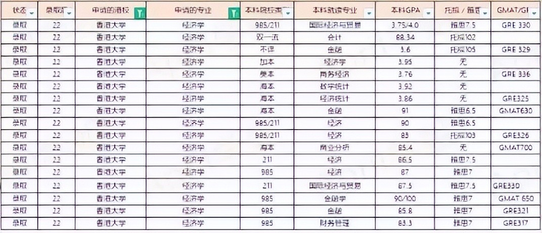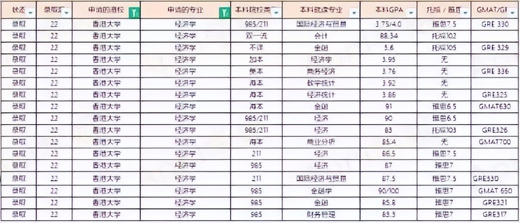 根据我统计的学生情况来看,港大商科类的申请要求最高:本科985/211/海本+GPA 87+托福100/雅思7+GRE 330/GMAT 670+多段优质实习经历。专业难度上金融>会计>经济>管理。