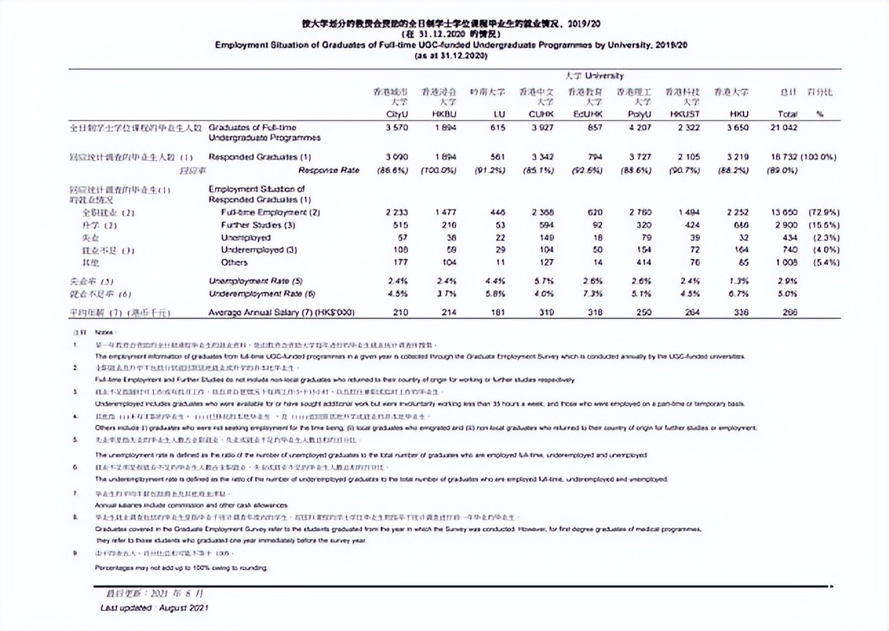 1)由于最近的疫情和更早的占中事件,大家印象当中香港的就业形势可能不太乐观,然而尽管如此,根据香港教资委官网公布的数据来看,港大还是以98.7%的全职就业率和336K港币的平均年薪高居就业水平第一位。