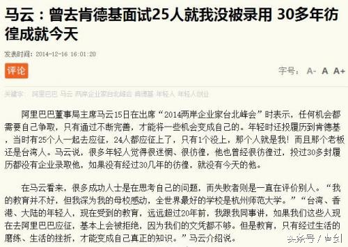 人们常说三十年河东,三十年河西,这句话一点都没错,马云在年轻时曾经投履历到肯德基,当时共有25个人一起去应征,结果其他24个人都应征上了,只有他一个人被淘汰。这件事深深的刺激到了当时的马云,并且非常的彷徨,而这一彷徨就是三十年。