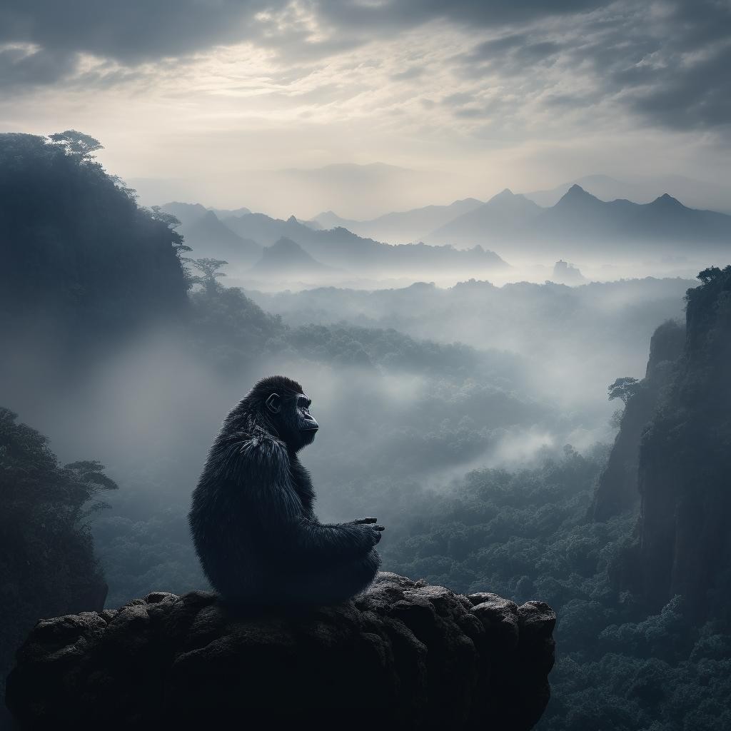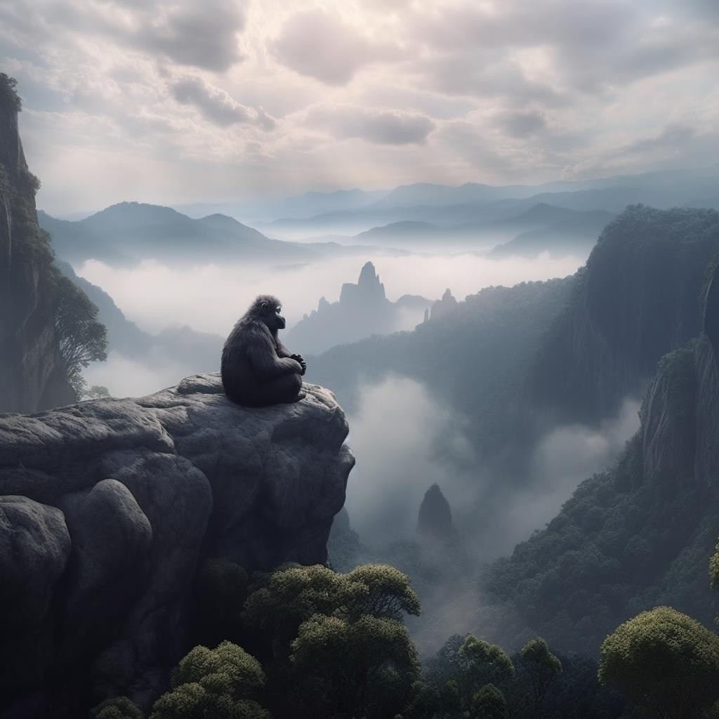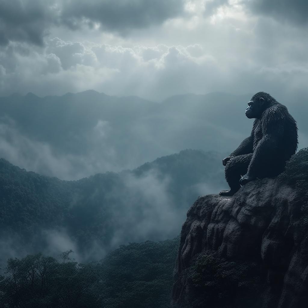 在山中发现一只静坐的猩猩,他是在思考什么呢,真是让人太好奇了。