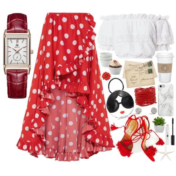 性感一字领+波点半身裙 再配上红色腕表。显得热情奔放 夏天的感觉~