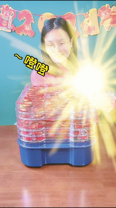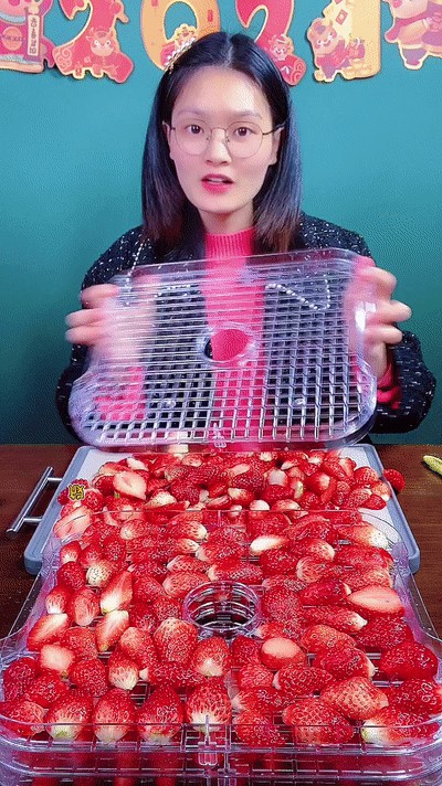 ③将切片完成的草莓放置烘干托盘上,放入烘干机,烘干17个小时即可完成啦!