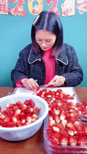 ②洗净的草莓去蒂切片,适合食用的大小就成。
