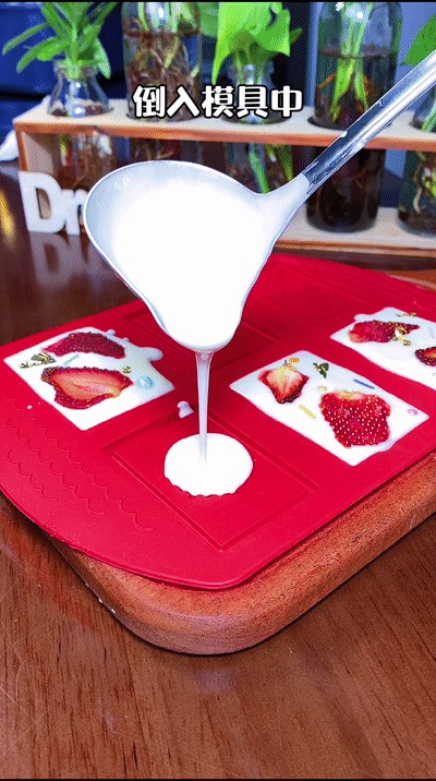巧克力融化后,倒入模具,放上草莓干和楚楚爱的糖豆,以及略显浮夸的可食用金箔。