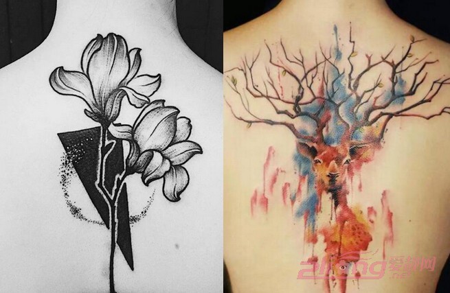 【女生后背纹身图04】以黑色为主描绘而成的花朵图案是那么的魅惑神秘,每一朵花瓣的纹身处理都是非常地细致,展现出最为逼真好看的视觉效果,而色彩鲜明的麋鹿纹身图案则跳脱灵动许多,布满后背的色彩搭配都能让人无法抵抗,晕染的纹身手法更是新颖独特,为纹身增添趣味。