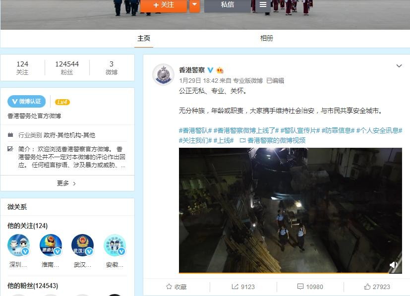 1月29日,香港警队官方微博@香港警察 正式上线,首日关注的粉丝已经超过3万人。截至发稿时,粉丝数量已超过12.5万。