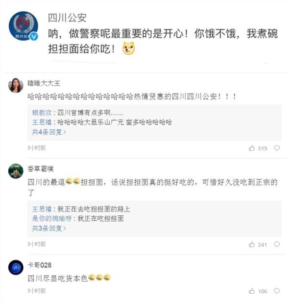 香港警察官博开通后,内地公安官博纷纷围观留言欢迎港警开博。评论大走港片风,其中四川公安引用港剧经典台词评论到,“呐,做警察呢最重要的是开心!你饿不饿,我煮碗担担面给你吃!”受到广大网友好评,可以说是非常接地气了。