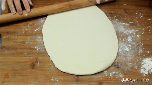 3.一个小时以后,我们在案板上撒上底面,把面团取出,发好的面里面都是蜂窝孔,把面团反复的揉搓,排出里面的空气,面团揉光滑以后,用手摁扁,再用擀面杖把它擀成长方形的面片,厚度大概3毫米就可以了。