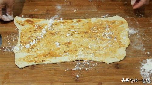 4.把准备好的油酥倒在面片上,用刮板刮均匀,油酥不要抹太多,薄薄的一层即可,太多的话,我们卷的时候容易把油酥挤出来,然后撒上一层干面粉,方便烧饼分层。