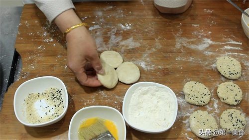 6.然后,我们把圆面胚按压成小饼,均匀刷上蛋液,再粘上一层芝麻,蛋液能够增加饼皮的黏性,防止芝麻脱落。