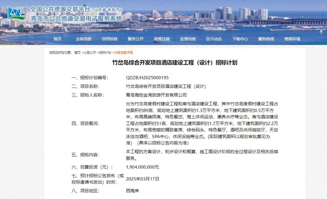 记者从青岛市公共资源交易电子服务系统获悉,近日,青岛海控金湾旅游开发有限公司发布竹岔岛综合开发项目酒店建设工程(设计)招标计划。