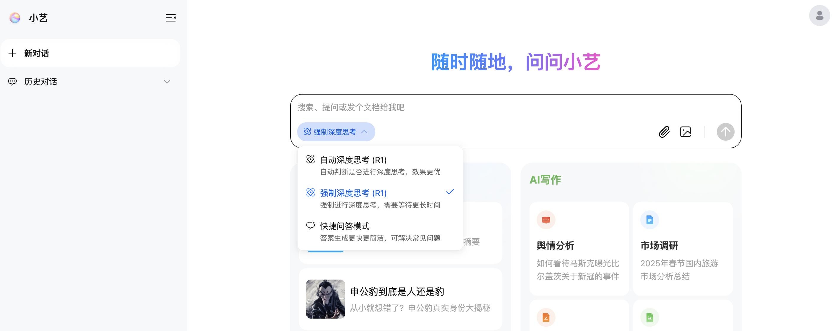 值得注意的是,网页版小艺助手引入了R1深度思考功能,用户可以根据需求自定义选择自动或强制深度思考模式,以获得更深入和个性化的回答。此外,用户还可以将小艺助手设置为默认搜索引擎,方便在浏览器中直接获取智能搜索结果。