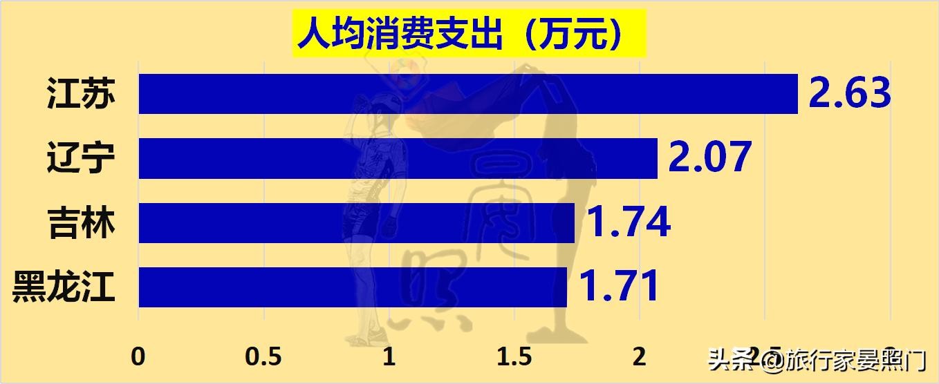 在居民消费力方面,辽宁虽然在收入上高于全国均值,但却在开支上再次低于全国均值,至于吉林、黑龙江两省,则依旧是全部低于全国均值至少20%,三省和江苏的几项核心财富值的差距始终保持在较高值。
