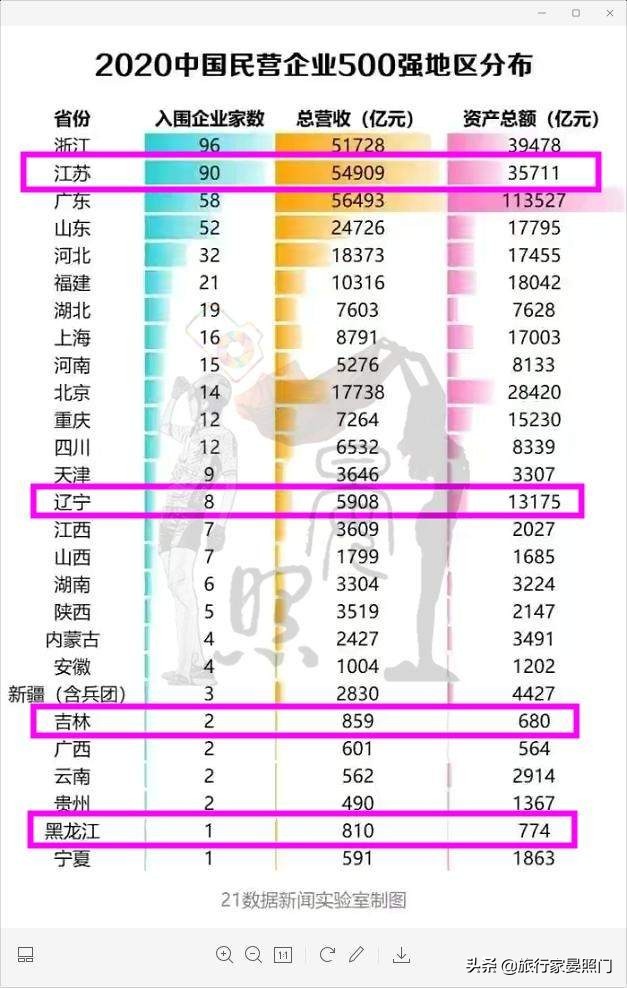在最能体现营商环境的民企500强数量和总营收上,东北三省共计11家,累计总营收7600亿不到,几乎全部只有江苏一省的十分之一左右。