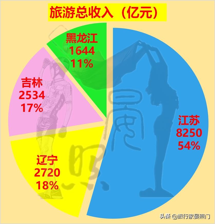 在全国文旅资源上同浙江一样鹤立鸡群的江苏,更是对东北三省毫无悬念,足足比三省文旅总收入之总和还要多20%。而在东北三省相互之间的首尾差值依旧有1.65倍。