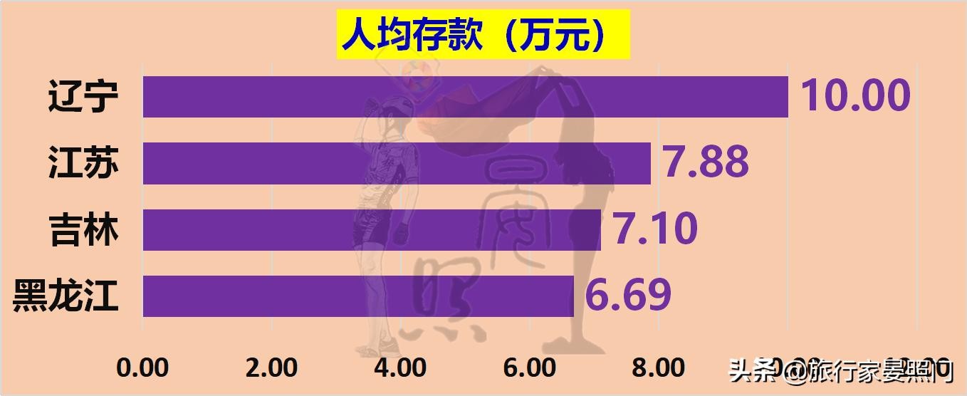 没想到在人均GDP、人均收入上全面落后江苏的辽宁,却在人均存款上“回光返照”,成功逆袭江苏。不仅如此,吉林也在人均财富值上终于有一项高于全国均值,即便是黑龙江,也仅仅低于全国均值1.6%,几乎和全国均值相差无几。
