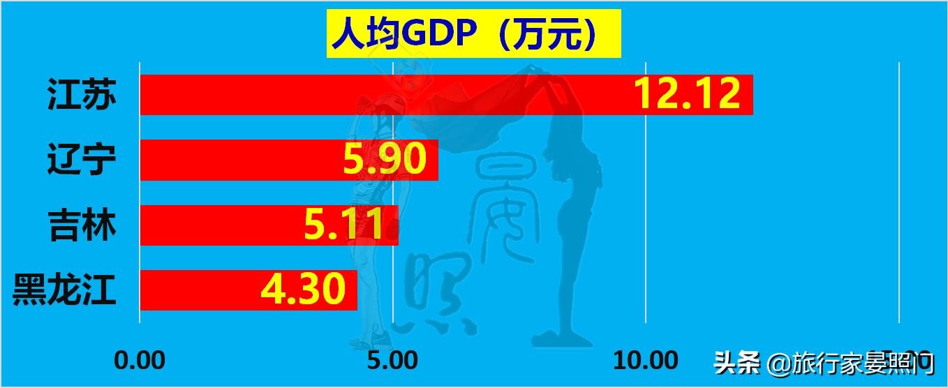 巧合的是,江苏高于全国均值68左右,黑龙江则低于全国均值68%。不仅如此,东北三省更是全部低于全国均值至少20%,即便是东北三省人均GDP最高的辽宁,也仅有江苏的一半不到,至于黑龙江,更是只有三分之一左右。