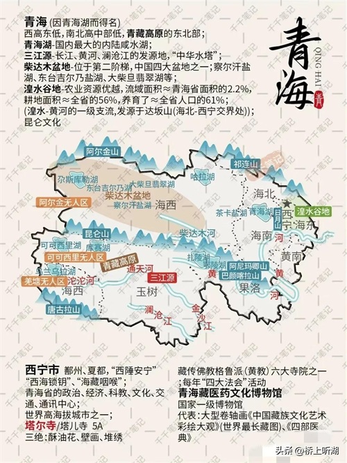 青海,位于神秘的青藏高原东北部,这里山川奇秀,地貌多姿。在这个均属高原范围的省份,平均海拔3000多米的壮丽景致。巍巍昆仑山纵贯中部,唐古拉山挺立南方,祁连山高耸北境,茫茫草原与浩瀚柴达木盆地相互交织,仿佛在大自然的绘画中徜徉。这里可不仅仅是地形的盛宴,它还是长江、黄河、澜沧江的摇篮,被誉为"三江源"。巴颜喀拉山更是黄河与长江的分水线,想象着这片土地见证了大江大河的诞生!