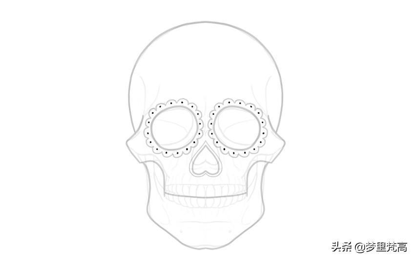 第3步:粗轮廓是强调形状的好方法。给眼窝一个像花一样的边缘,勾勒出鼻子的轮廓。