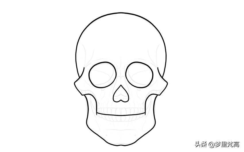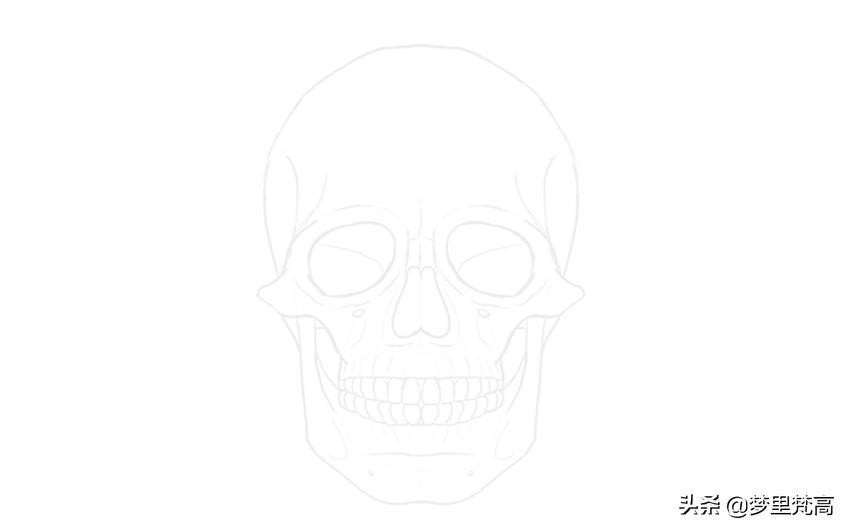 第1步:首先,您需要某种头骨模板。它可能是真实头骨或图画的照片。随意使用我的教程“ 如何绘制头骨”中的插图。如果要进行数字绘图,只需将其放置为不透明度较低的图层即可。如果您使用的是传统绘画方式,请用铅笔将头骨追溯到一张新纸上。轻轻地做,以便以后可以删除这些行。