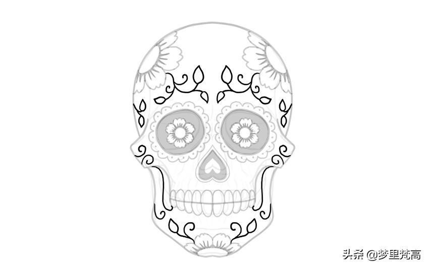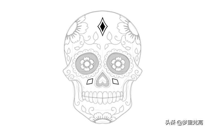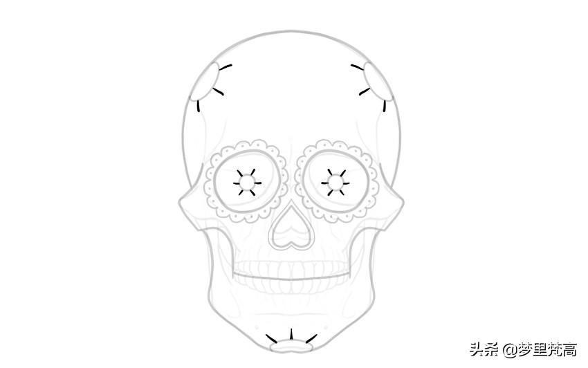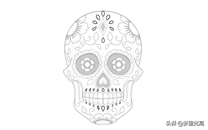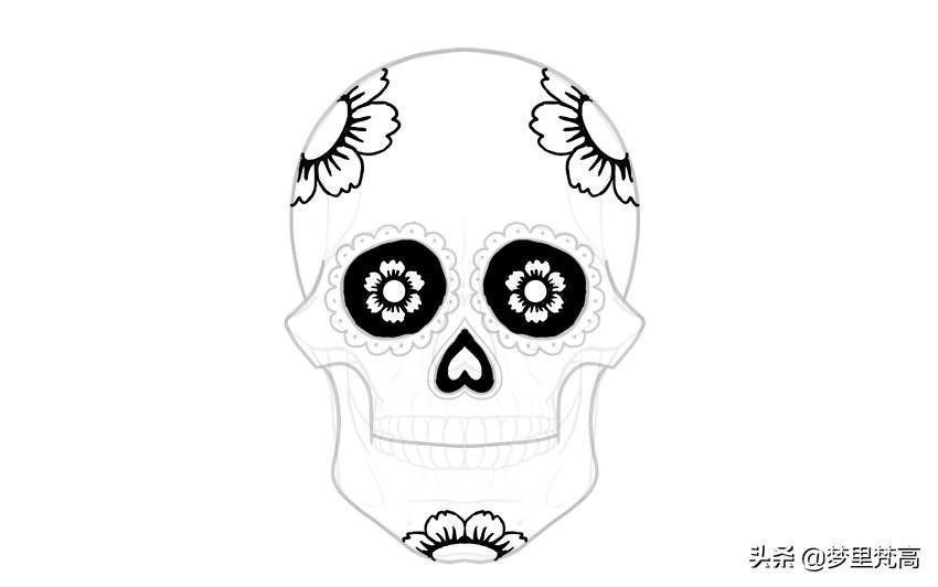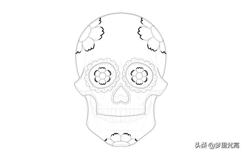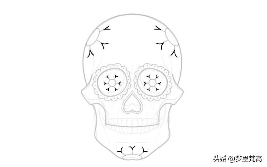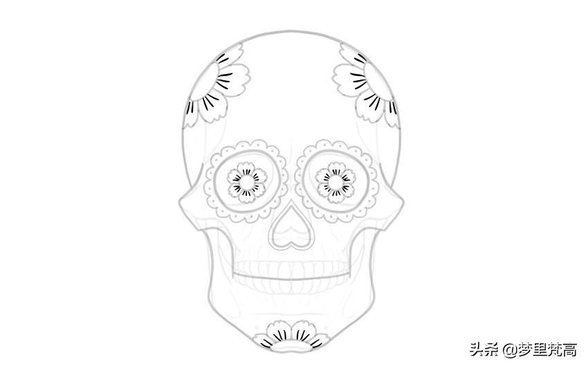 第14步:最后,擦除/删除头骨的辅助线,并清理这些辅助线。如果在线条的厚度中添加一些变化,那么即使是简单的装饰也会看起来错综复杂。
