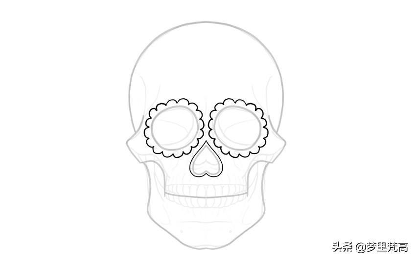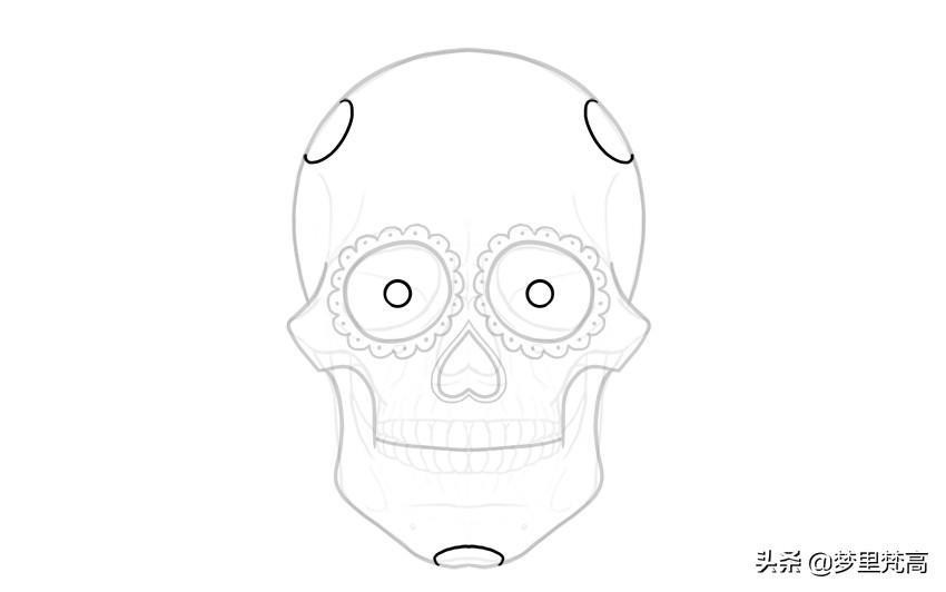 第2步:用墨水或其他深色工具绘制头骨的基本轮廓。糖头骨倾向于被大量程式化,因此可以随意修改形状作为样式的一部分。