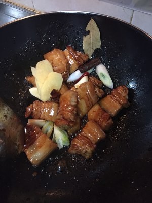把配料入锅继续翻炒,转中火,炒出配料的香味,倒入生抽,料酒,待料酒收干后加入提前准备好的温水(冷水会使肉煮出来有点柴)。