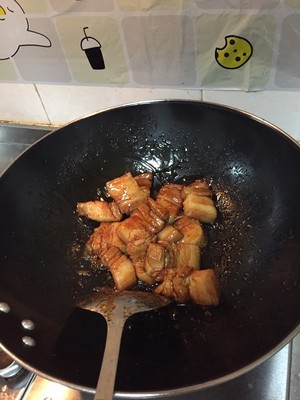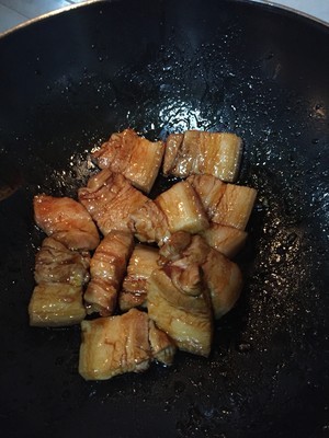 肉切小块焯水(直接把切好的肉放冷水里,不盖盖子烧开后再稍微煮一会就好)前面的步骤忘记拍了,从炒糖色开始吧,锅里倒入适量油,大火加热转小火,把冰糖放锅里炒,用铲刀一个个拍碎,完全溶化后不停的翻炒,有细腻泡沫出来的时候把五花肉倒入锅内,翻炒两分钟左右,翻炒后上色均匀。