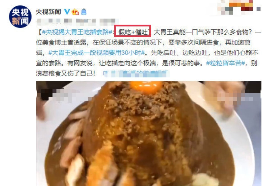 此前,央视新闻曾发布一则动态批评大胃王吃播套路,称他们假吃加催吐。虽然视频中的主播们都被打了码,但是还是有粉丝通过背景、服装等因素确定了被批评的主播中有大胃王mini。