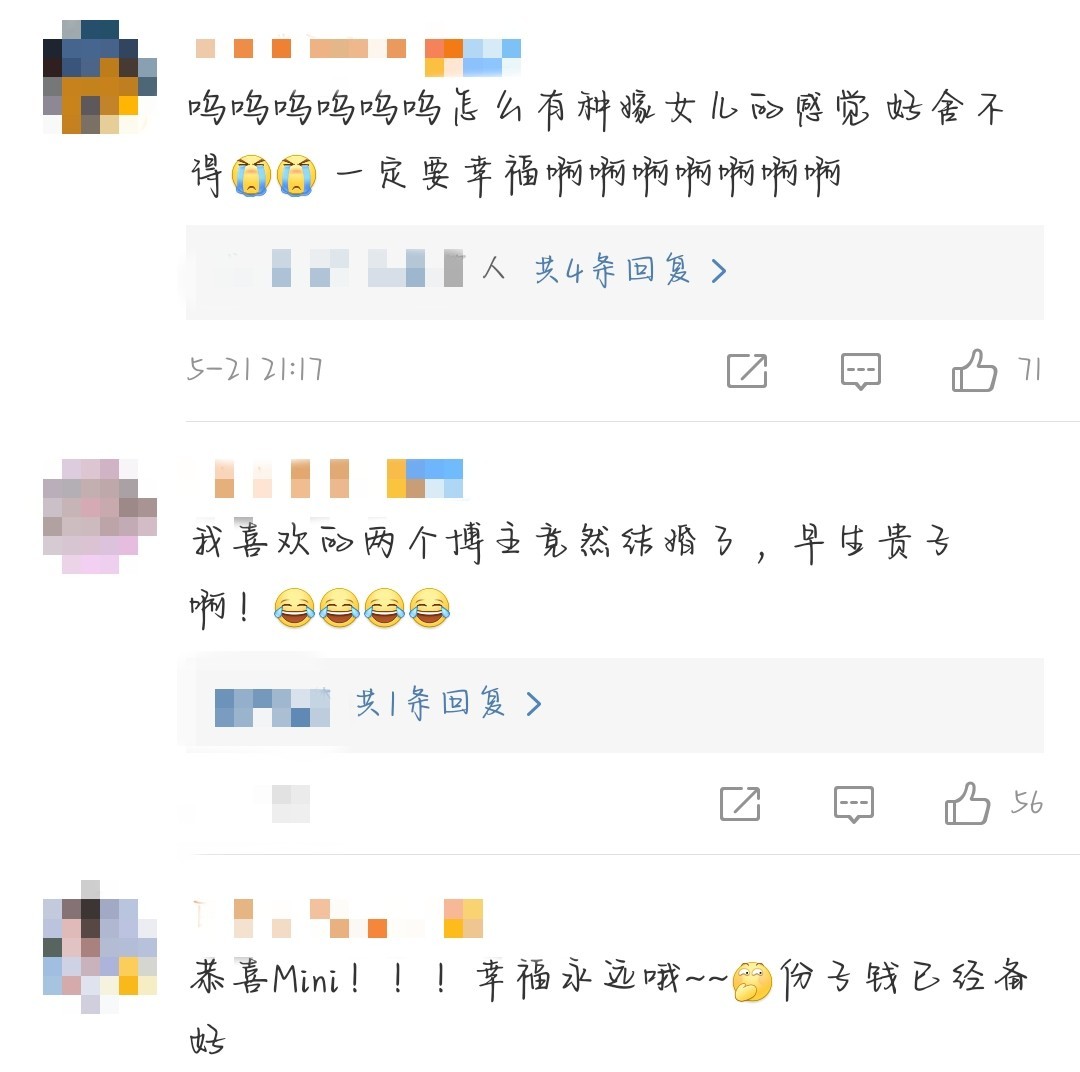 网友们对于这个突如其来的喜讯也发表了自己的祝福,有网友感慨“怎么有种嫁女儿的感觉,好舍不得,一定要幸福啊”。也有网友表示“我喜欢的两个博主竟然结婚了,早生贵子啊”,还有网友调侃“份子钱已经备好”。