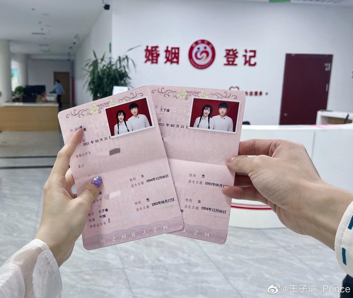 随后,照片中的男主角王子瑜也在社交账号上发布了两个人在婚姻登记处手持结婚证拍摄的照片。两个人将彼此的结婚证紧紧地挨在一起,就像是以后密不可分的他们。