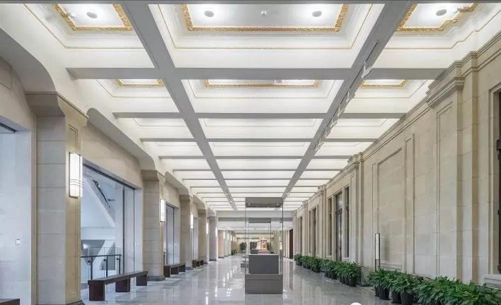 从博物馆进门处的青花瓷水磨石地面、运用金刚喷砂打造的千文生僻字文化墙、世界最高的室内中国园林半亩园,将金丝楠木古式亭台、明清武康岩地砖、千年紫藤及高山杜鹃展现于半亩园,是古典江南园林的再现。在移步游赏的过程,仔细观察,还可见到走廊墙面嵌有中国传统老工艺作坊的展示。