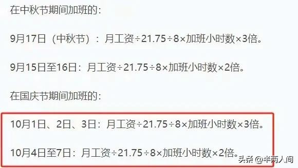 如果实在没法请假,还有个好消息,那就是加班工资。国庆前几天,10月1日到3日,加班可以拿到三倍工资,而10月4日到7日的加班则是双倍工资。