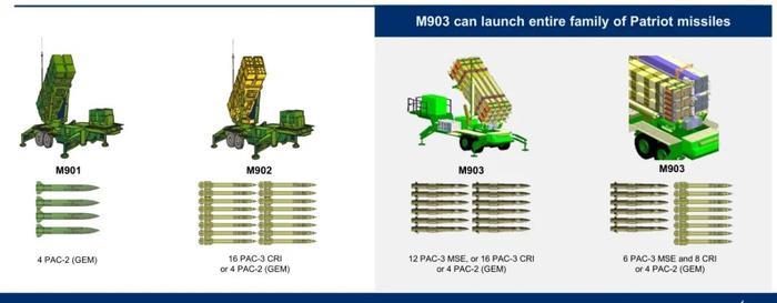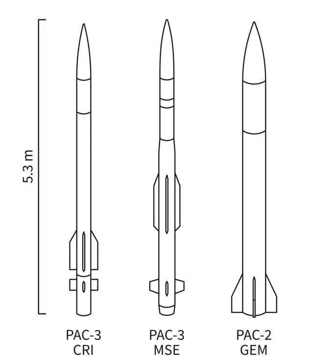 PAC-3防空导弹与之前的PAC-2完全不同。PAC-2采用的是无弹翼布局,弹体非常粗,而PAC-3导弹则采用了碳纤维结构较小直径的弹体以增加载弹量,一个发射架最多可携带16枚。布局变成了弹尾十字布局梯形弹翼与矩形尾舵,弹重320千克,弹长5.2米,弹径0.255米,翼展0.5米,固体推进剂燃料重量为160千克,弹头与助推火箭在飞行中不分离,始终保持一个整体。该弹对弹道目标作战距离30-40千米,作战高度15-20+千米,拦截弹道导弹目标高度不超过15千米,最大飞行速度4.1马赫,采用C波段半主动+Ka波段全主动雷达制导。后来美国人又发展了PAC-3 MSE导弹,具有更大的双脉冲固体火箭发动机、弹体中部的梯形弹翼,更大的尾舵以及升级的电池等,以适应更高的性能和更大的导弹射程。