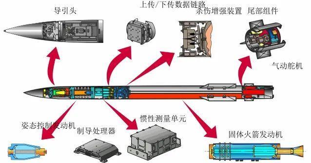 PAC-3导弹结构包括导引头、姿态控制发动机、惯性测量单元、制导处理器、无线电数据传输装置、杀伤增强装置、固体火箭发动机、气动控制舵机。导引头采用Ka波段毫米波主动导引头,波束宽度4°,圆锥视场全锥角90°,中心频率为35GHz,波长为8.6mm,作用距离大约在8-10千米。配备了180个8厘米28克固体推进剂的姿态控制发动机的ACS舱段进行末段修正,PAC-3导弹的战斗部部分长度约127毫米,总质量为8.2千克,包括330克主装药和沿着外圆周排列为两个同轴圆环的24个近圆柱形破片,采用直接命中方式。