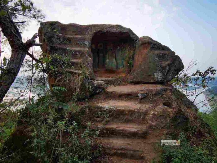 这块悬崖边的巨石,一侧为梯步,一侧为造像龛。相传,葛洪在此借石一步登天,飞身而去留下的脚印,故当地人习惯称此山为“大脚仙”。