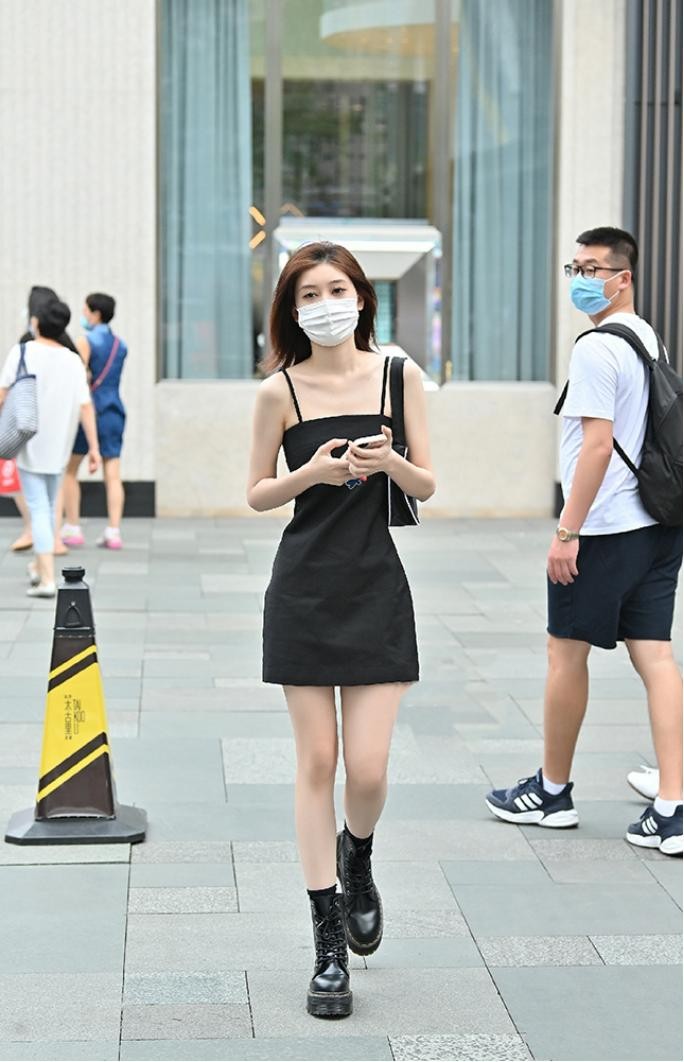 再来看看这位迎面走来的小姐姐,气场不是一般的足,这小细腰大长腿,身材真是太好了,还穿了一件黑色的小吊带。将精致的锁骨和纤细的瘦腰展现得一览无余,而且靓丽的外表看起来非常的有攻击性。看看旁边的大哥都走不动啦,足以可见小吊带的魅力有多大。