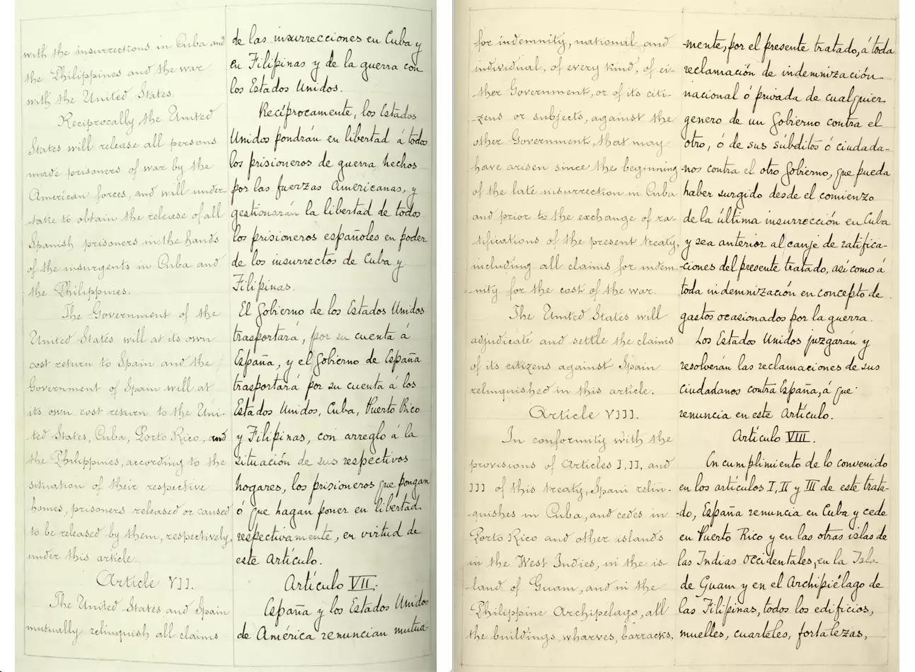 构成巴黎条约的19页中的第8页和第9页结束了美西战争。西班牙将古巴,波多黎各,关岛和菲律宾放弃给美国,