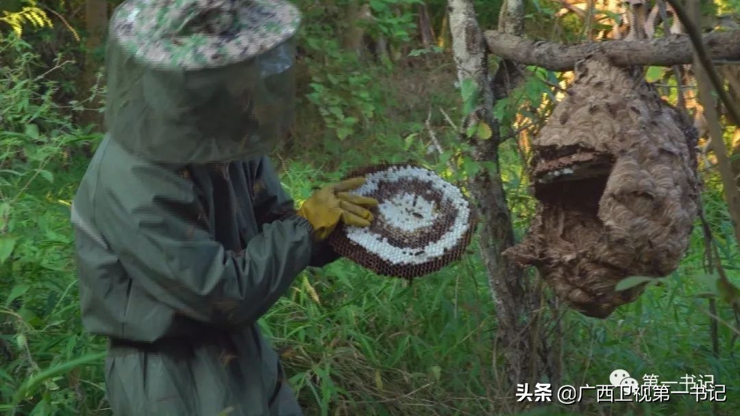 马蜂蜂巢,呈六角形筒状。一层一层叠加,蜂巢具有明显等几何特征。蜂蛹,是养蜂人获取经济回报的宝贝。作为一种高蛋白食物,蜂蛹一直以来都受到吃货们的追捧。每年8月份,村民就开始为期三个月的蜂蛹收割,一窝一年可以割3-4次,一次4-10斤。这几年,通过出售蜂蛹和种蜂等,老罗的年收入超过了10万元。