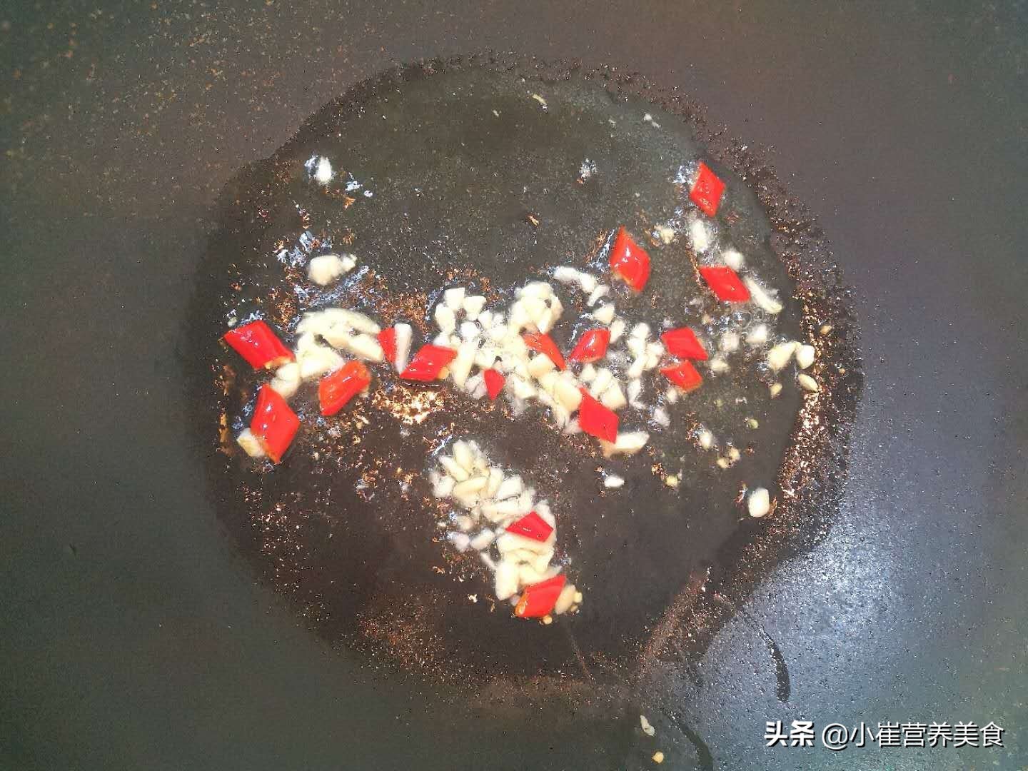 4.炒锅热油,油热放入蒜末,辣椒段爆香。