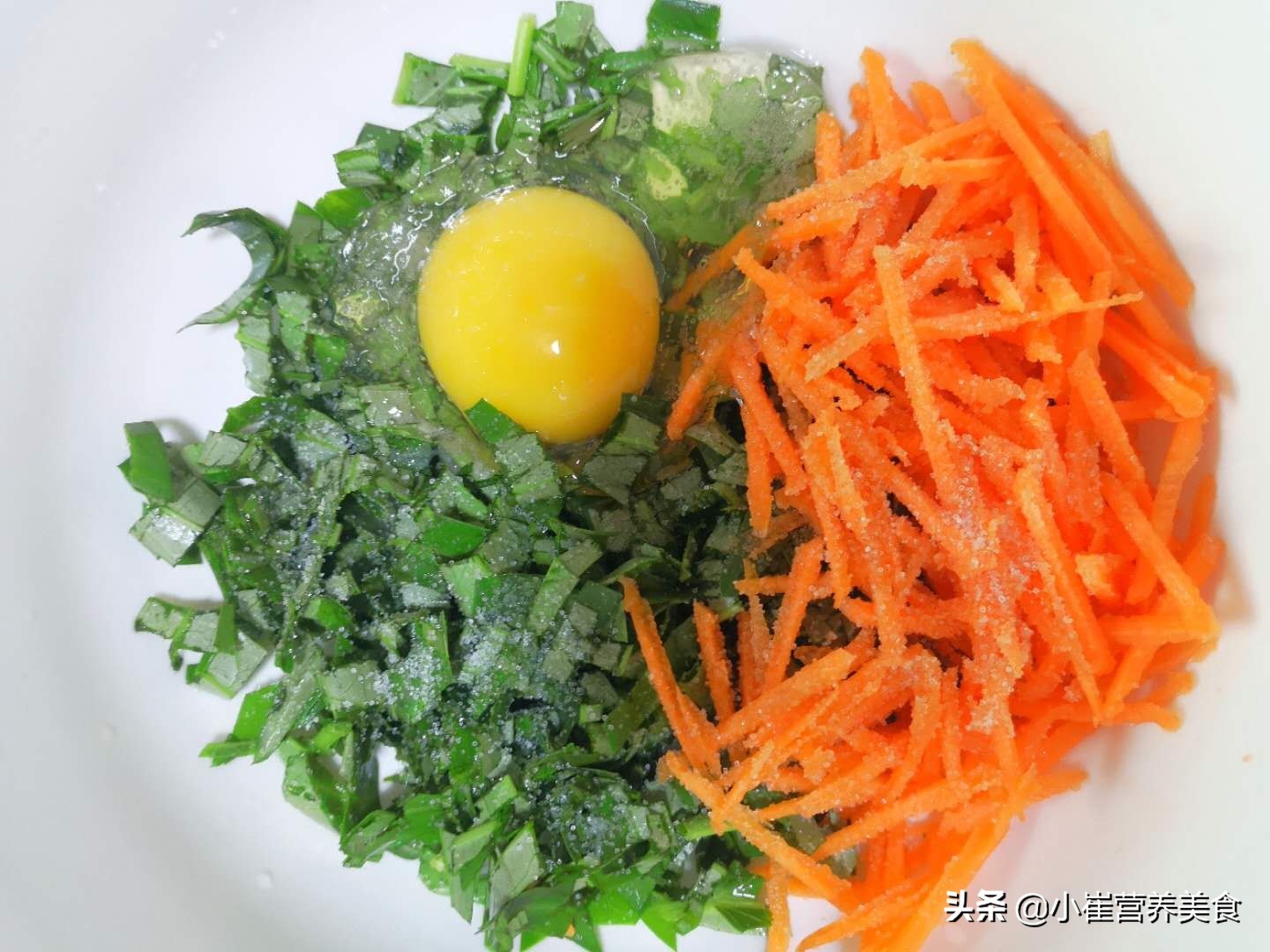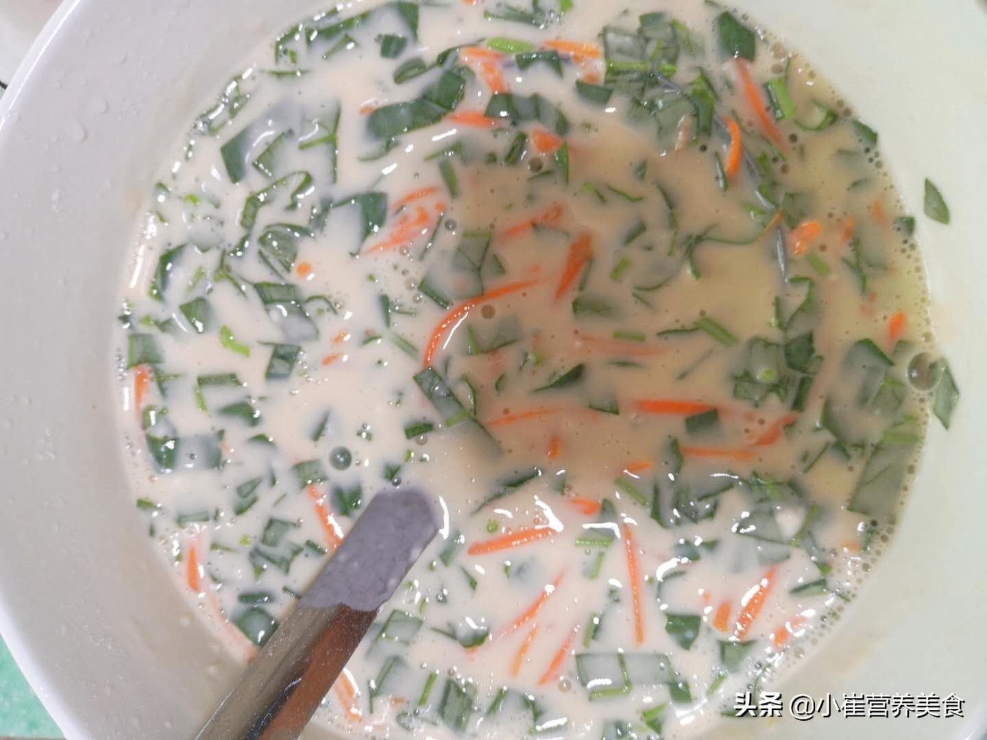 1.摘下来的空心菜叶取一小部分洗干净切碎,胡萝卜洗净擦丝放入一个大碗中,打入一个鸡蛋,放适量盐搅拌均匀。